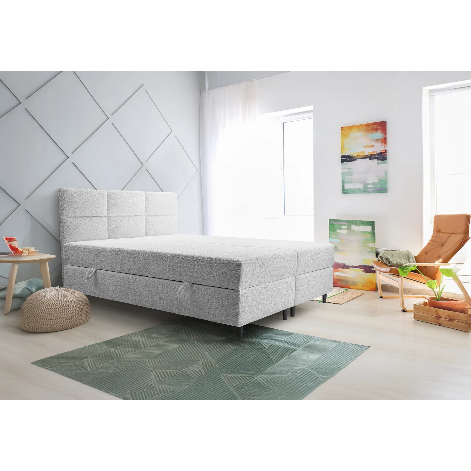 - Gepolstertes Kopfteil mit eleganter geometrischer Steppung, das dem Bett einen stilvollen Charakter verleiht und zusätzlichen Komfort bietet.