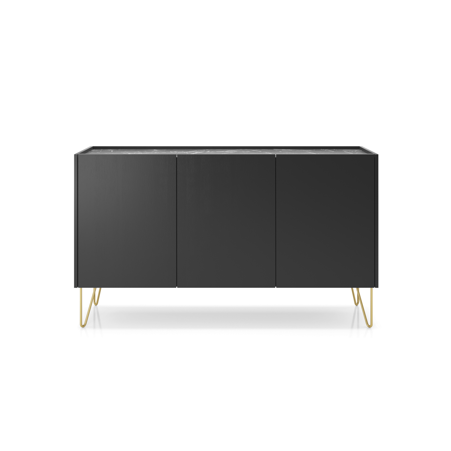 Zusätzlich vereint die Kommode Harmony K144 Luxus, Funktionalität und modernen Stil. Ihr elegantes Aussehen wird durch die glänzende Oberfläche des schwarzen Marmors und die hohen goldenen Beine unterstrichen, die dem Möbelstück einen Hauch von Eleganz verleihen. Dadurch passt die Kommode perfekt in verschiedene Arrangements.