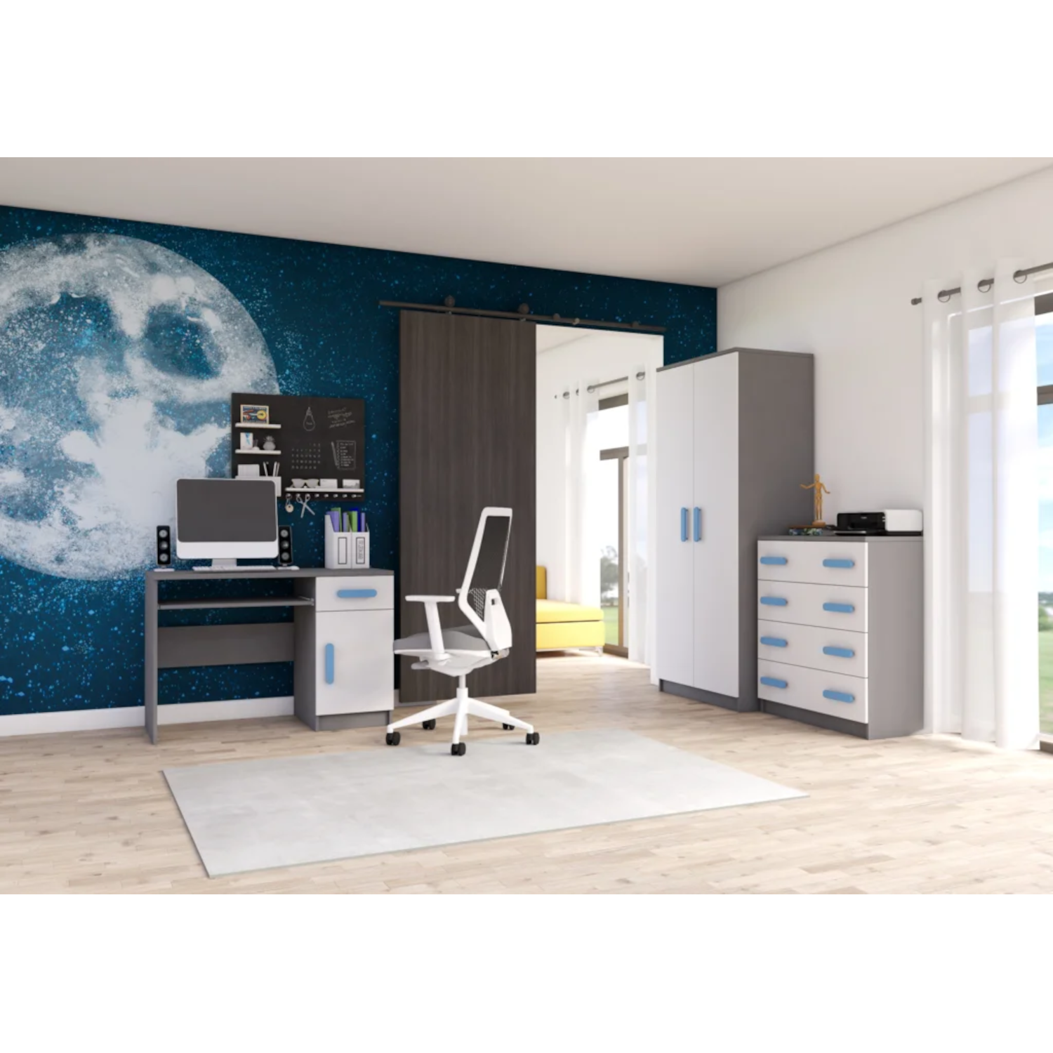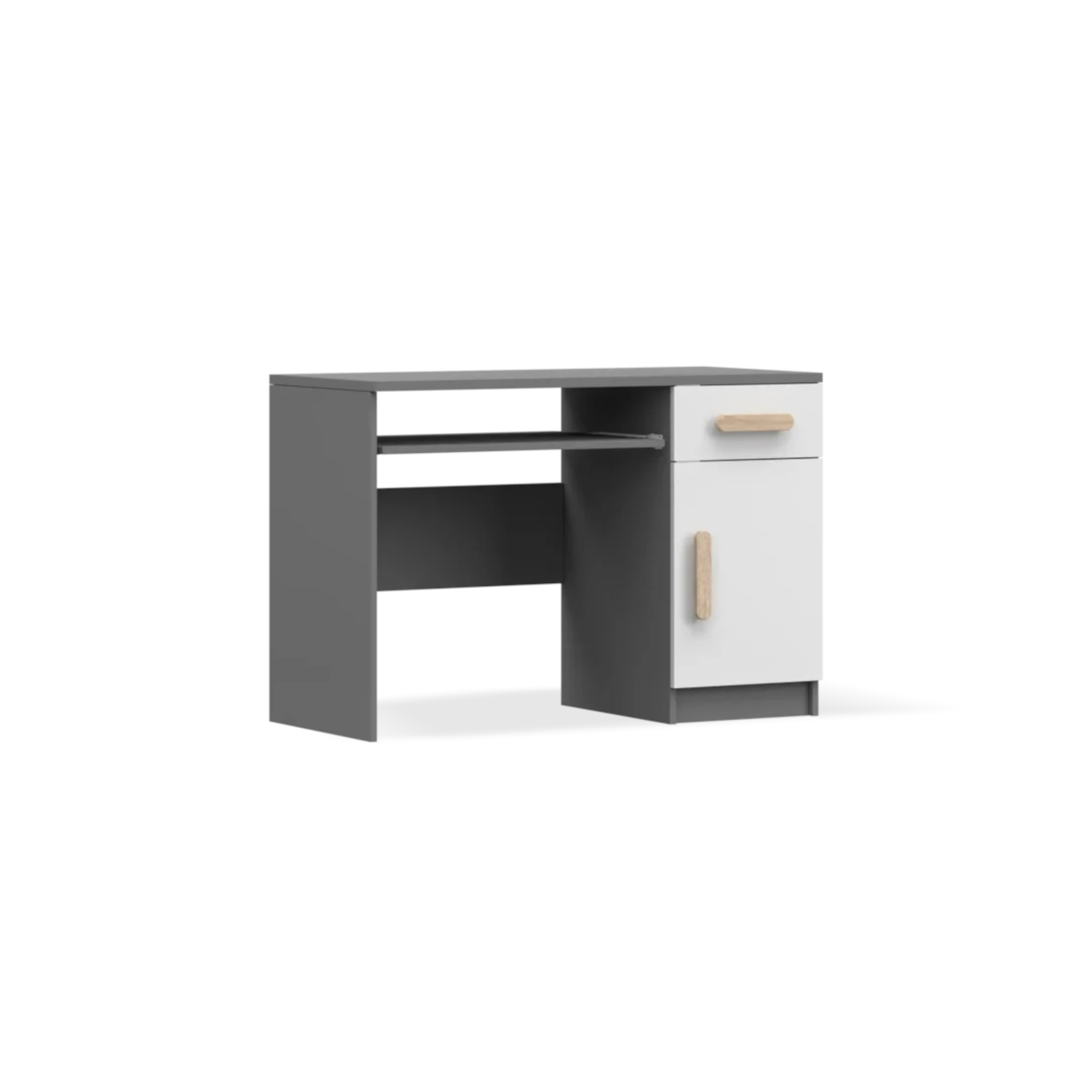 Der Schreibtisch LOLA II ist ein modernes und funktionales Möbelstück, das sich perfekt für das Kinder- oder Jugendzimmer eignet. Durch seine durchdachte Konstruktion und die universelle Farbkombination aus Grau und Weiß fügt sich der Schreibtisch harmonisch in verschiedene Einrichtungsstile ein. Die Möglichkeit, die Farbe der Griffe individuell zu wählen, macht ihn besonders anpassungsfähig an persönliche Vorlieben.
